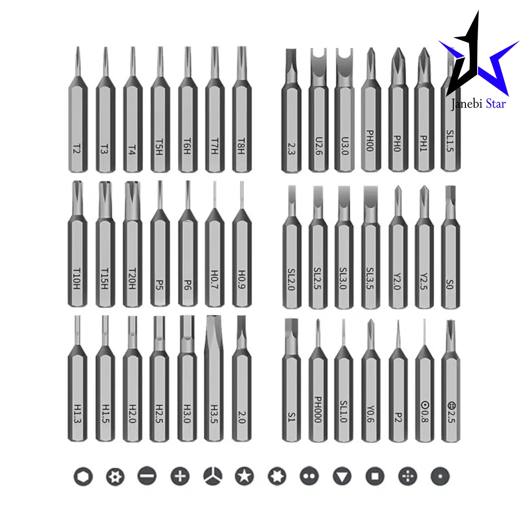 - تعداد قطعات: ۴۴ عدد (شامل سریهای مختلف + دسته اصلی + ابزار جانبی)
